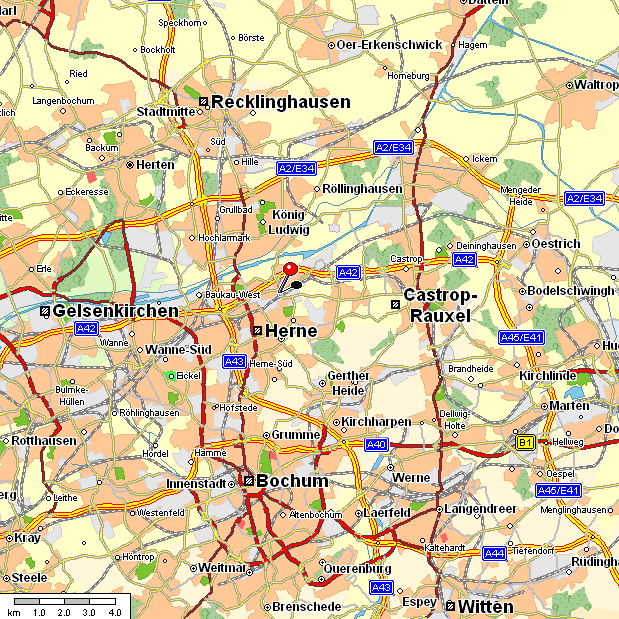 | Aus Richtung Wuppertal: Sie fahren auf die A43 Richtung Münster. Wechseln Sie am AK Herne auf die A42 Richtung Dortmund / Castrop Rauxel. Benutzen Sie auf der A42 die Abfahrt HERNE HORSTHAUSEN (23). - Dies ist die zweite Abfahrt nach dem AK Herne - Jetzt fahren Sie links und biegen danach in die 2. Strasse rechts ein. Sie sind nun auf der Josefinenstraße und sehen unser Fachwerkhaus auf der linken Seite. | |||||||||||||||||||||||||||||||||||||||||||||||||||||||||||||||||||||||||||||||||||||||||